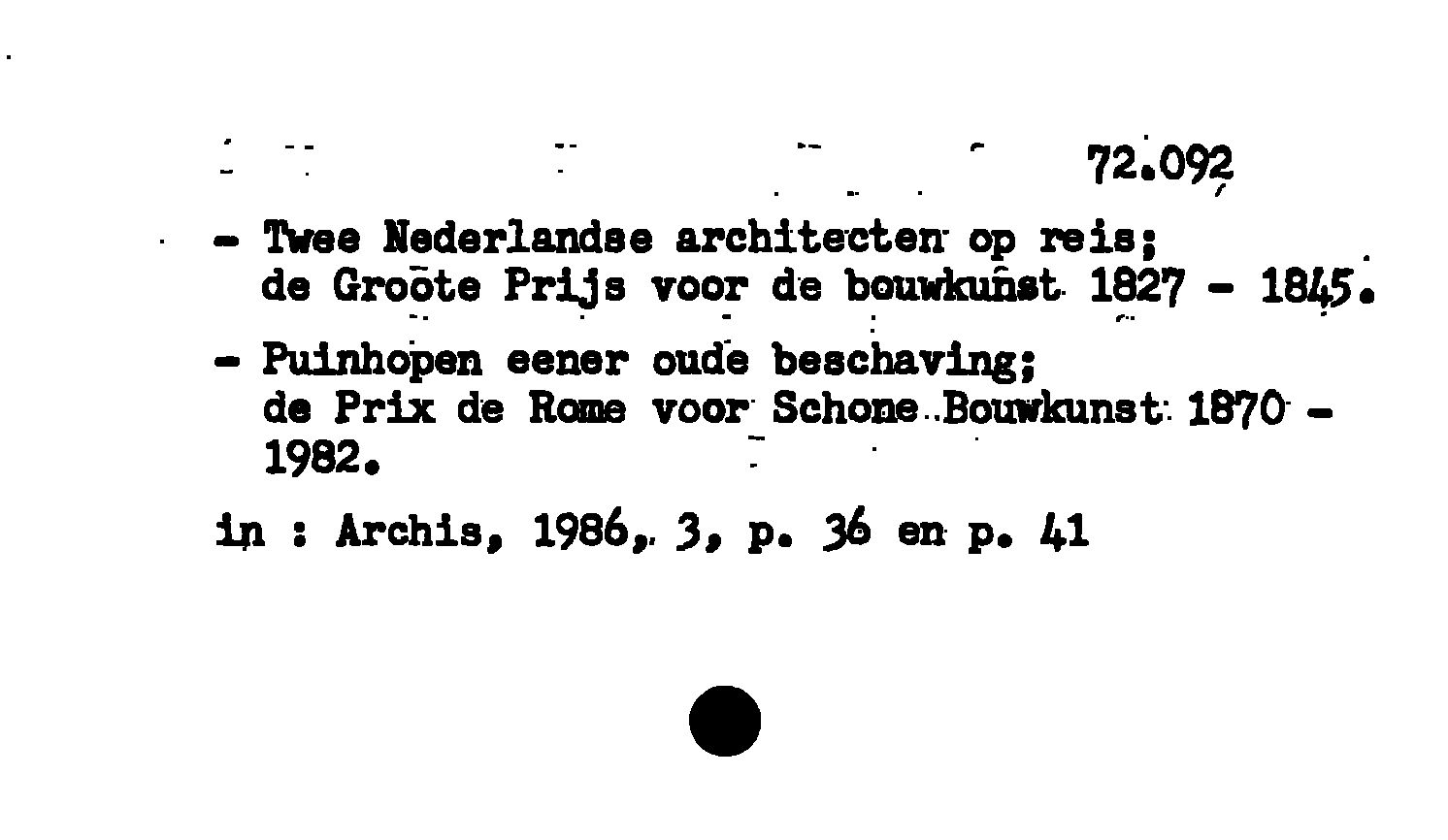 - Twee Nederlandse architecten oreis; de Groote Prijs voor de bouwkunst 1827 - 1845 : Puinhopen eener oude beschaving; de Prix de Rome voor Schone Bouwkunst 1870 -1982.