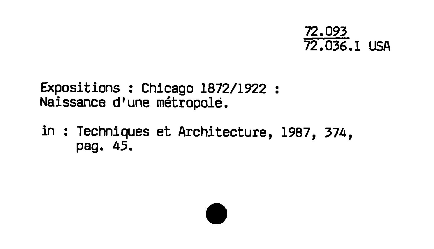 - Expositions : Chicago 1872/1922 ; Naissance d'une métropole