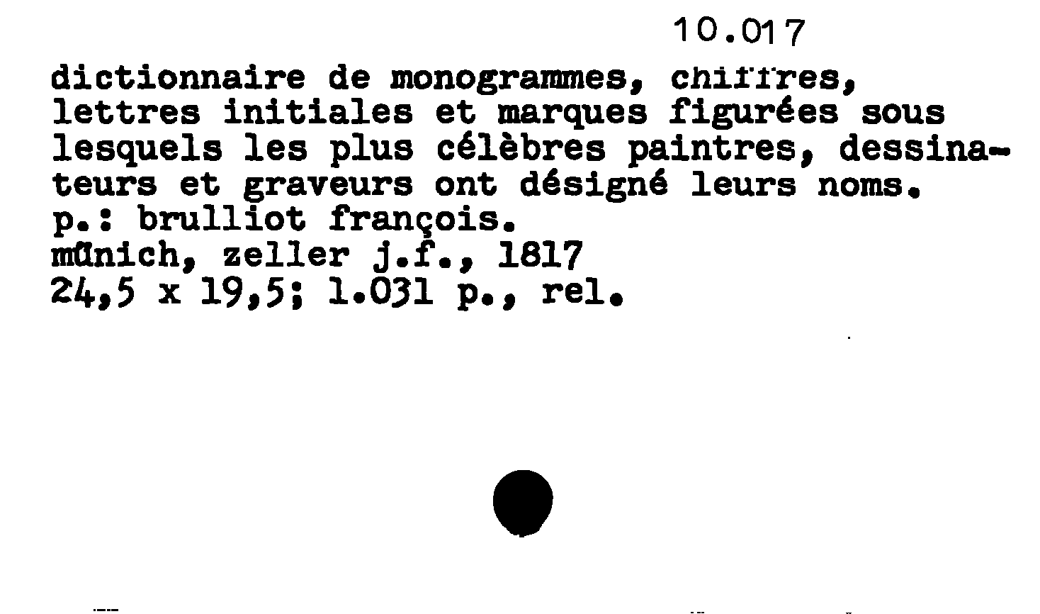 - dictionnaire de monogrammes, chiffres, lettres initiales et marques figurées sous lesquels les plus célèbres peintres, dessinateurs et graveurs ont désigné leurs noms.