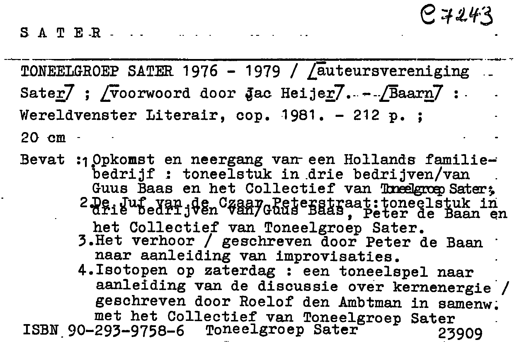 Toneelgroep Sater 1976-1979 : Opkomst en neergang van een Hollands familiebedrijf; De juf van de Czaar Peterstraat; Het verhoor; Isotopen op zaterdag.