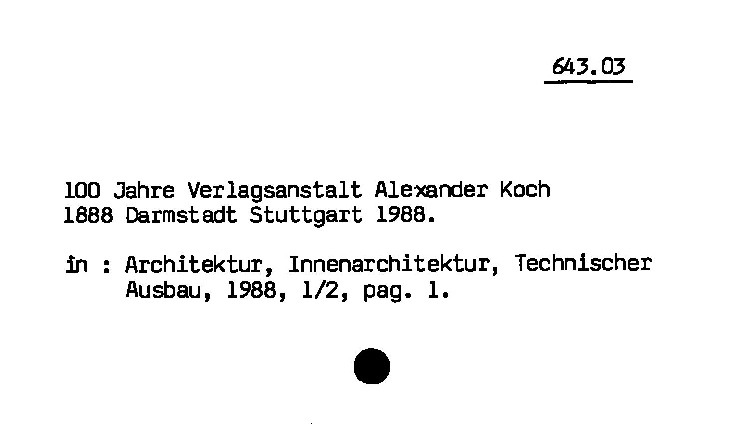 - 100 Jahre Verlagsanstalt Alexander Koch : 1888 Darmstadt Stuttgart 1988