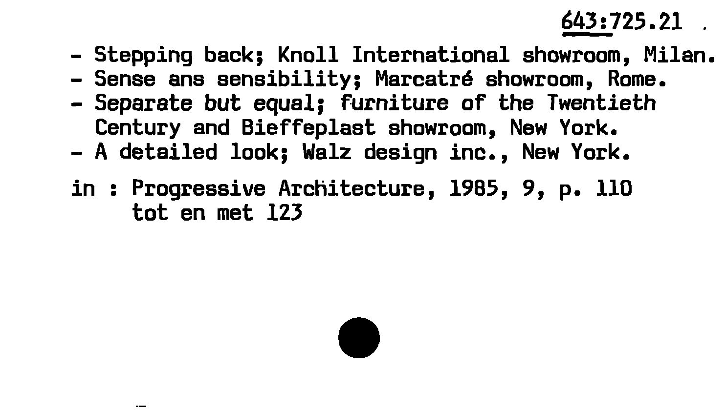 Stepping back; Knoll International showroom, Milan. Sense and sensibility; Marcatré showroom, Rome. Separate but equal; furniture of the Twentieth Century and Bieffeplast showroom, New York. A detailed look; Walz design inc., New York