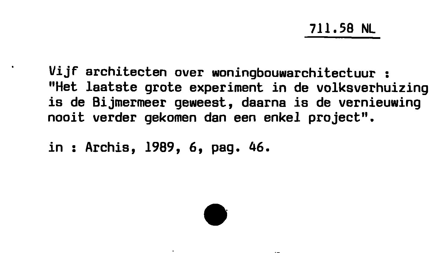 - Vijf architecten over woningbouwarchitectuur : Het laatste grote experiment in de volksverhuizing is de Bijmermeer geweest, daarna is de vernieuwing nooit verder gekomen dan een enkel project