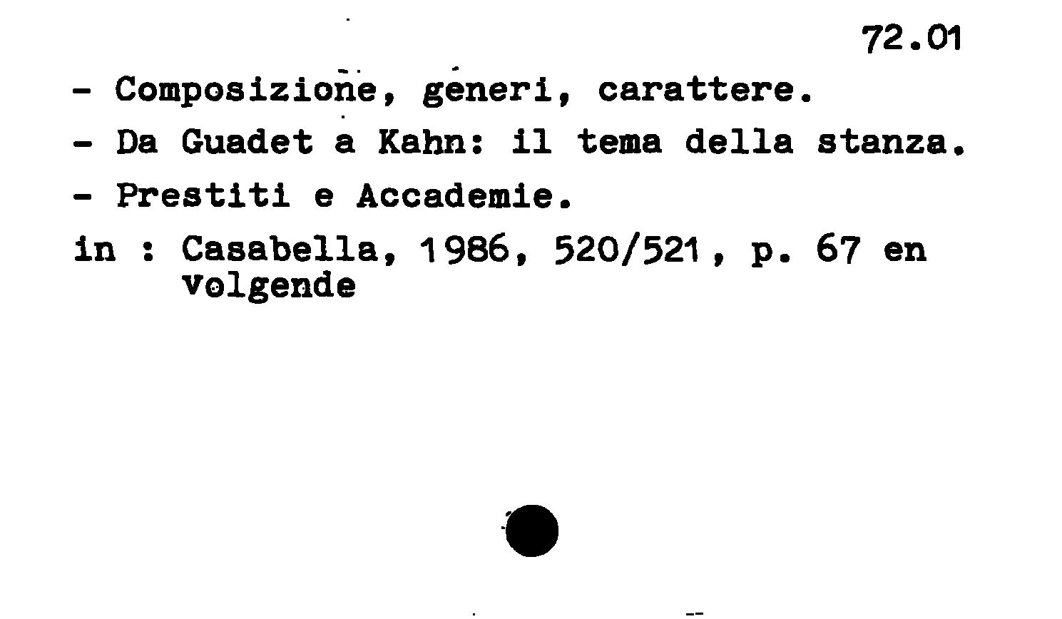 - Composizione, generi, carattere : Da Guadet a Kahn: il tema delta stanza ; Prestiti e Accademie