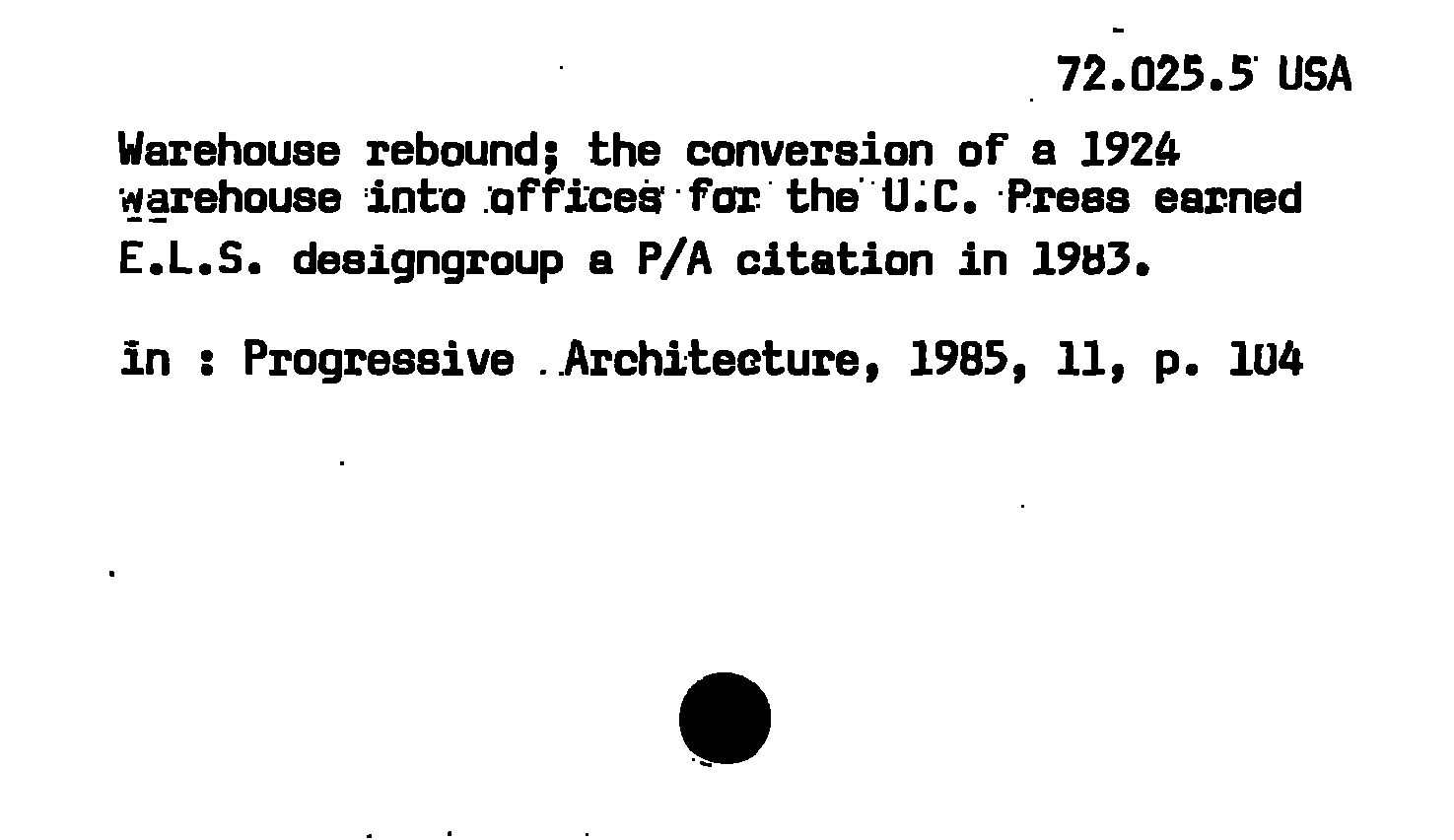 - Warehouse rebound : the conversion of a 1924 warehouse info offices for the U.C. Prees earned E.L.S. designgroua P/A citation in 1983
