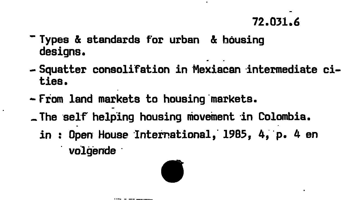 - Types & standards for urban & housing designs. Squatter consolifation in Mexiacan intermediate cities. From land markets to housing markets. The self helping housing movement in Colombia