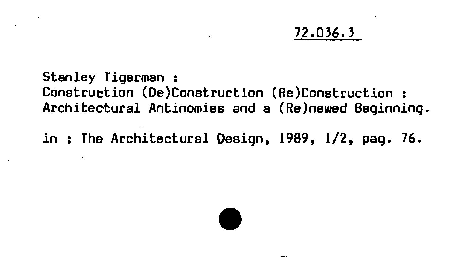 - Stanley Tigerman : Construction (De)Construction (Re)Construction ; Architectural Antinomies and a (Re)nemied Beginning