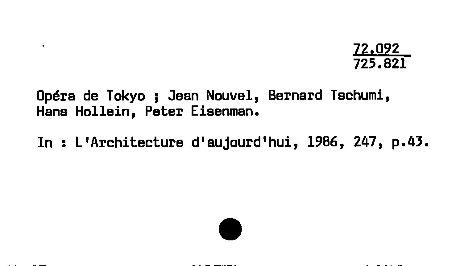 - Opéra de Tokyo : Jean Nouvel, Bernard Tschumi, Hans Hollein, Peter Eisenman