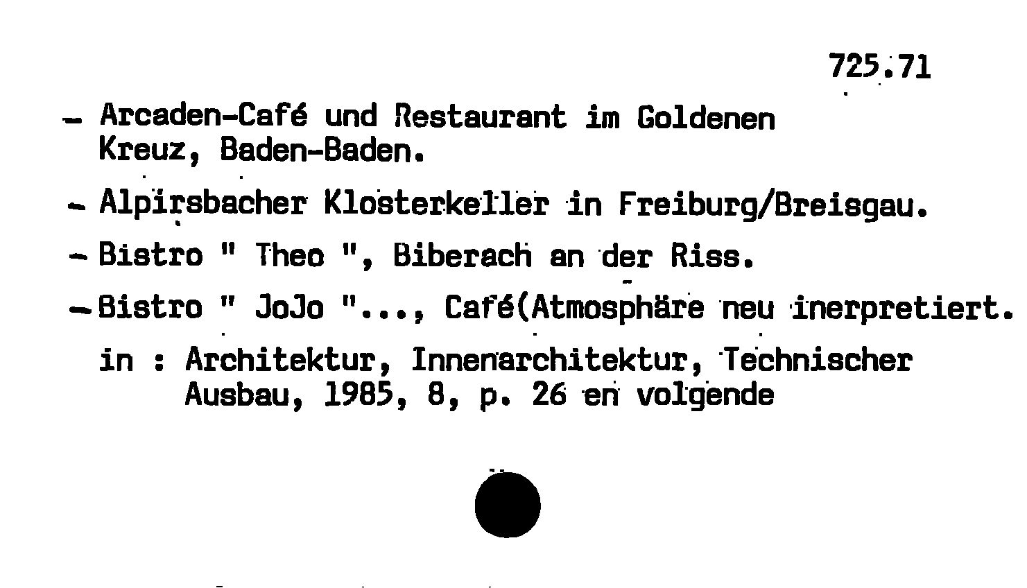 - Arcaden-Café und Restaurant im Goldenen Kreuz, Baden-Baden : Alpirsbacher Klosterkeller in Freiburg/ Breisgau ; Bistro " Theo ", Biberach an der Riss
