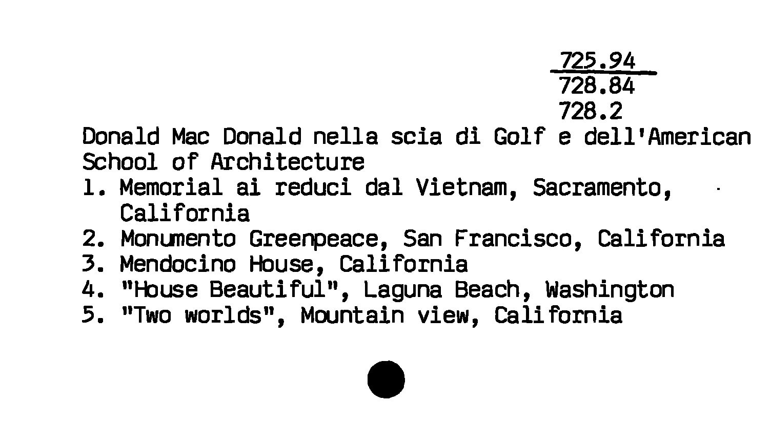 - Donald Mac Donald nella scia di Golf e dell'American School of Architecture : 1. Memorial ai reduci dal Vietnam, Sacramento, California 2. Monumento Greenpeace, San Francisco, California 3. Mendocino House, California 4. "House Beautiful", Laguna Beach, Washington 5. "Two worlds", Mountain view, California 6. Condominio Broadway-Vallejo a San Francisco 7. Condominio Clay Street a San Francisco