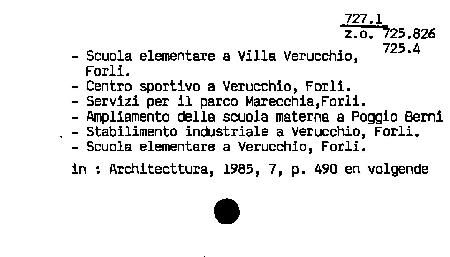 - Scuola elementare a Villa Verucchio, Forli. Centro sportivo a Verucchio, Forli. Servizi per il parco Marecchia,Forli. Ampliamento della scuola materna a Poggio Berni. Stabilimento industriale a Verucchio, Forli. Scuola elementare a Verucchio, Forli