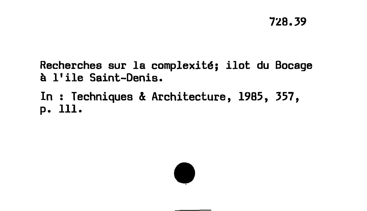- Recherches sur la complexité : ilot du Bocage è l'ile Saint-Denis