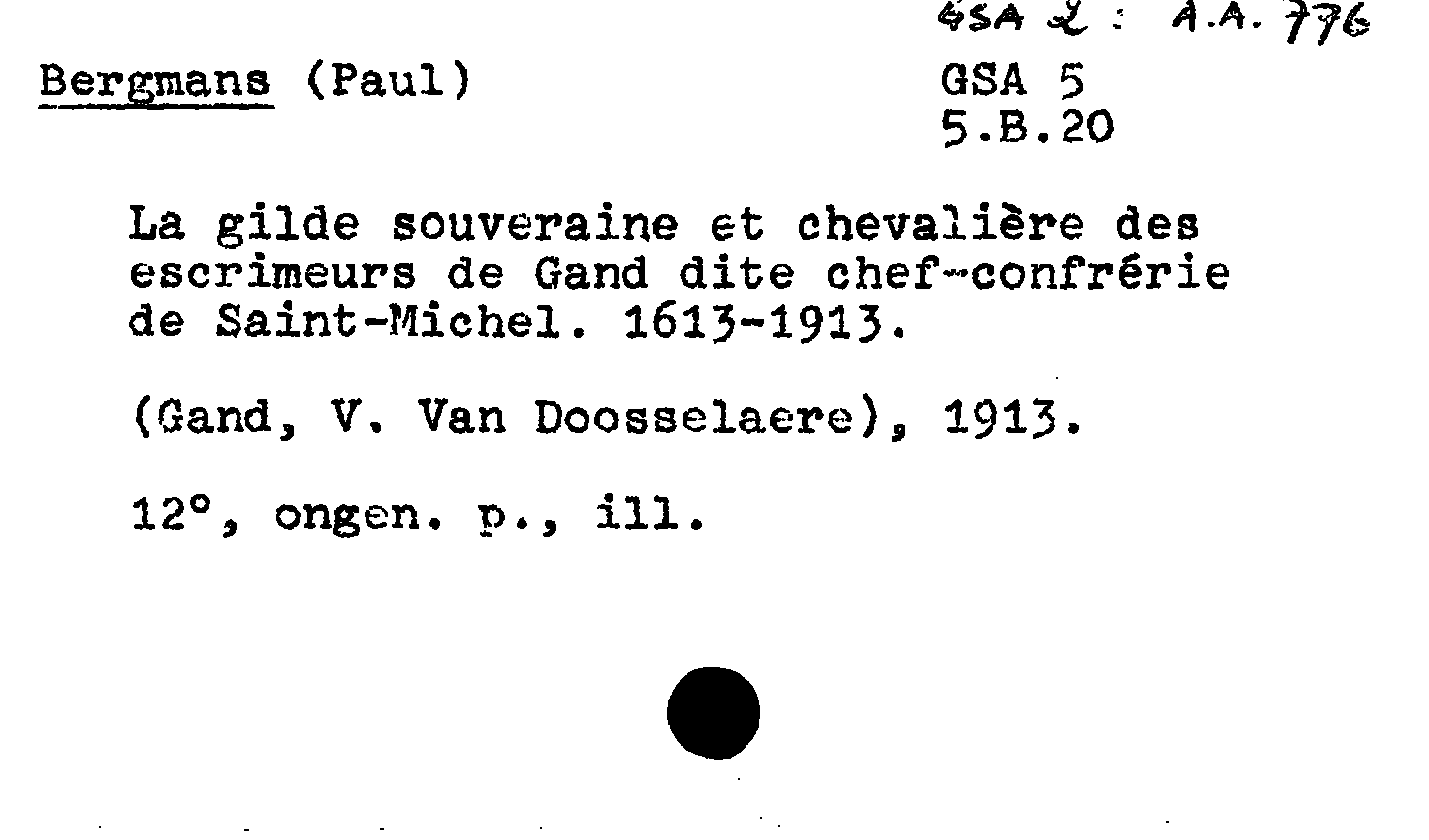 - La gilde souveraine et chevalière des escrimeurs de Gand dite chef-confrérie de Saint-Michel : 1613-1913