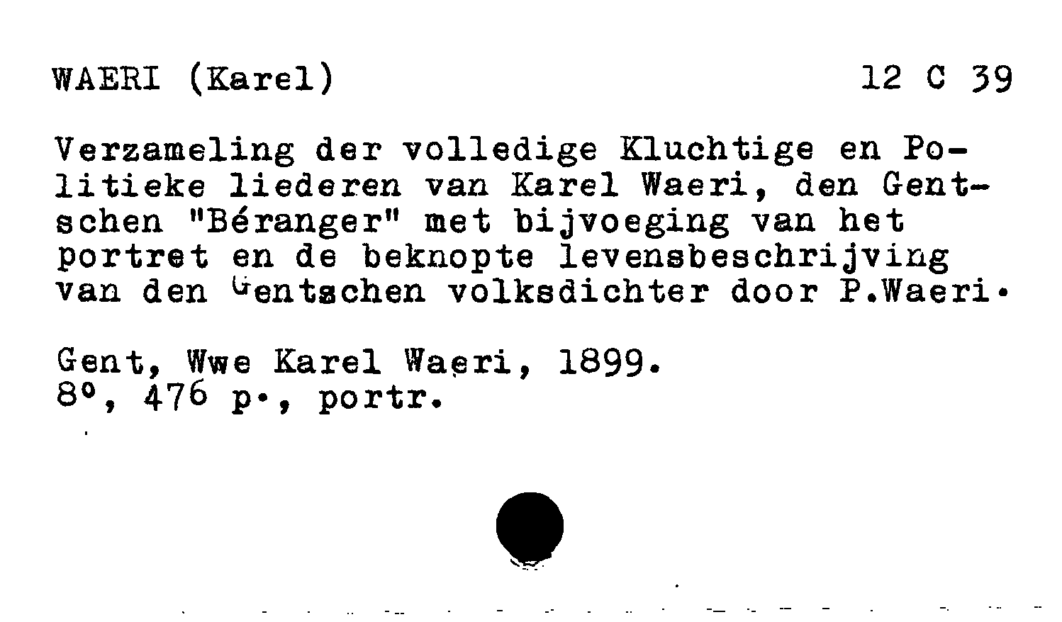 - Verzameling der volledige kluchtige en politieke liederen van Karel Waeri den Gentschen Beranger : met bijvoeging van het portret en de beknopte levensbeschrijving van den Gentschen volksdichter